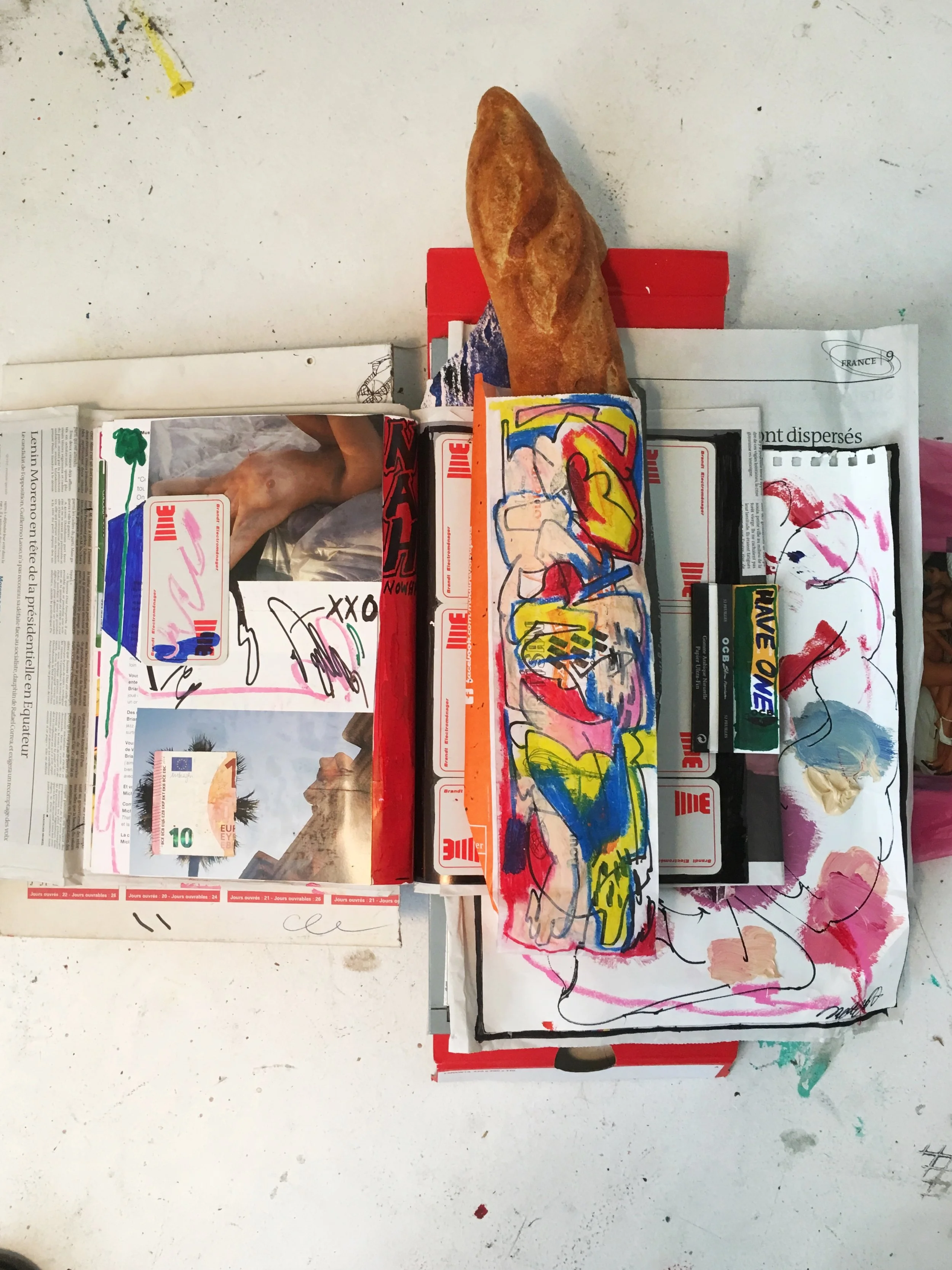 My practices consist of both two- and three-dimensional works. In two dimensions I produce large scale oil paintings on canvas and smaller mixed media works on paper. My works on paper, which I refer to as “works on paper” simply to categorize- not because they are all on paper – are comprised of collage elements and both figurative and abstract drawing done with office grade supplies rather than archival materials. The collage elements I work with come from current paper media; the daily printed press is a huge inspiration to my work. Art exists to me as a visual and tactile experience in which I play more the role of a craftsman than I do a director of culture. I do not formulate thoughts or opinions on the symbolic nature of my work before the work itself is fully actualized in my eyes and make most of my process decisions based on composition or color-structure elements; the practice for me is in motivating the viewers eye to maintain dialogue with the page, not on cultural inclination but, on some chemical principle that draws the eye in to each piece regardless of what it might be ‘saying’. Often inwardly interested in the financial implications of my practice, the materials I work with all hold for me symbols of social value as my subject matter. The clash of oil paint- the historic medium of the wealthy and privileged used to depict imagery of luxury items and decadent foods shown across hand-crafted canvas structures- with accessible media of boxed crayons, BIC pens, and fluorescent stickers on the recognizable compositions of the Sports Sunday page of the New York Times. I am constantly fascinated with themes of futility, de-valuation, non sequiturs, and the ambiguity and understanding of cultural luxury.